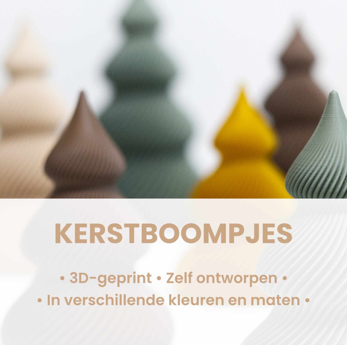 De boompjes worden geprint in PLA. Dat is een biobased kunststof dat wordt gemaakt uit natuurlijke grondstoffen zoals suikerriet of maïs. Het is licht, stevig en geschikt voor decoratief gebruik binnenshuis.