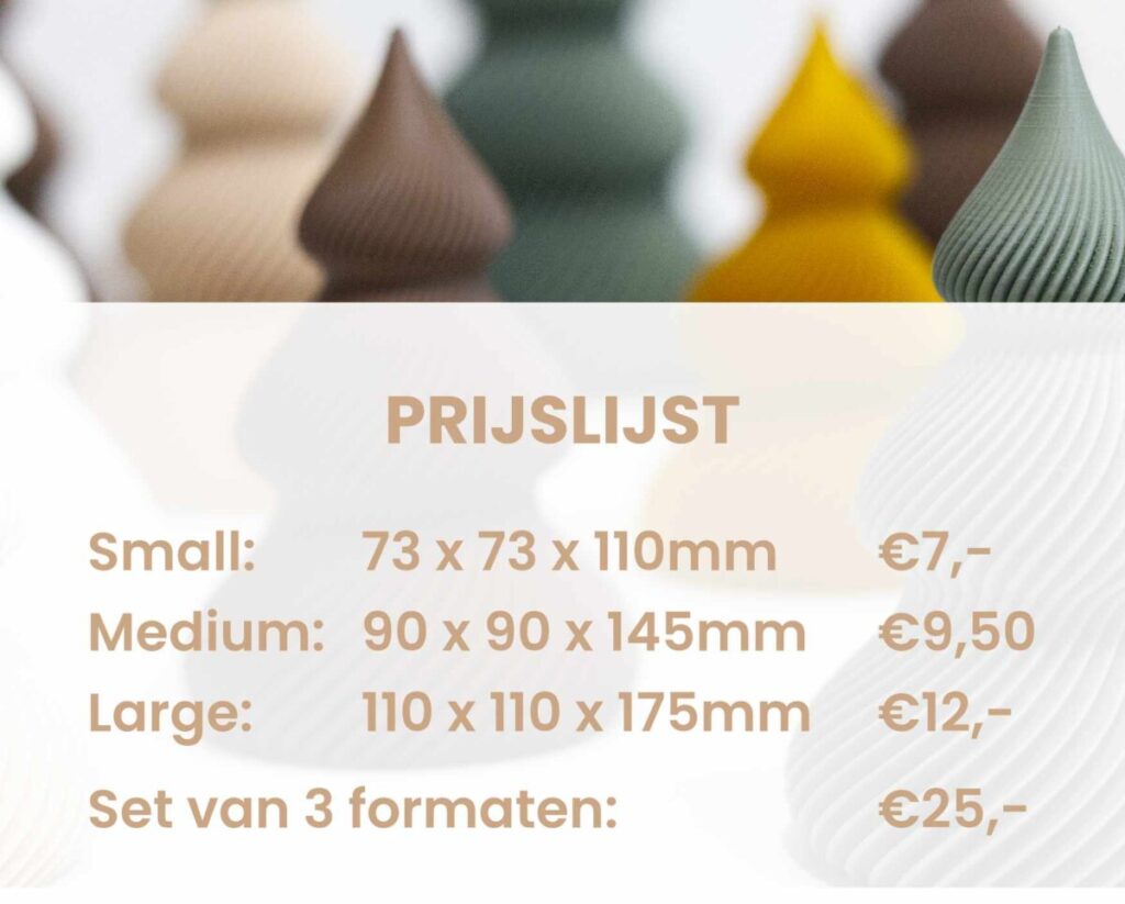 De prijzen zijn gebaseerd op het ontwerp, materiaal, de printtijd, de kosten van de printer en het handmatig verwerken van elke bestelling. Ik print elk boompje apart en werk in kleine oplage, waardoor het een uniek item blijft.